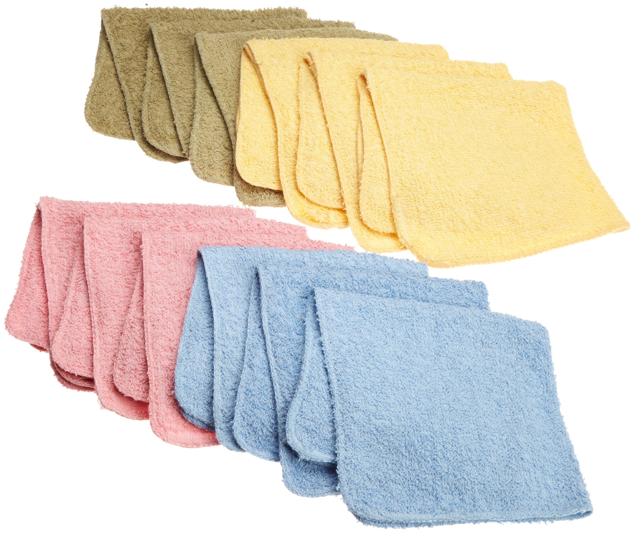 12 piece Economy Wash Cloth set; size 12×12 Yellow, Blue, Sage, Rose manufactured by Ashley Mills,